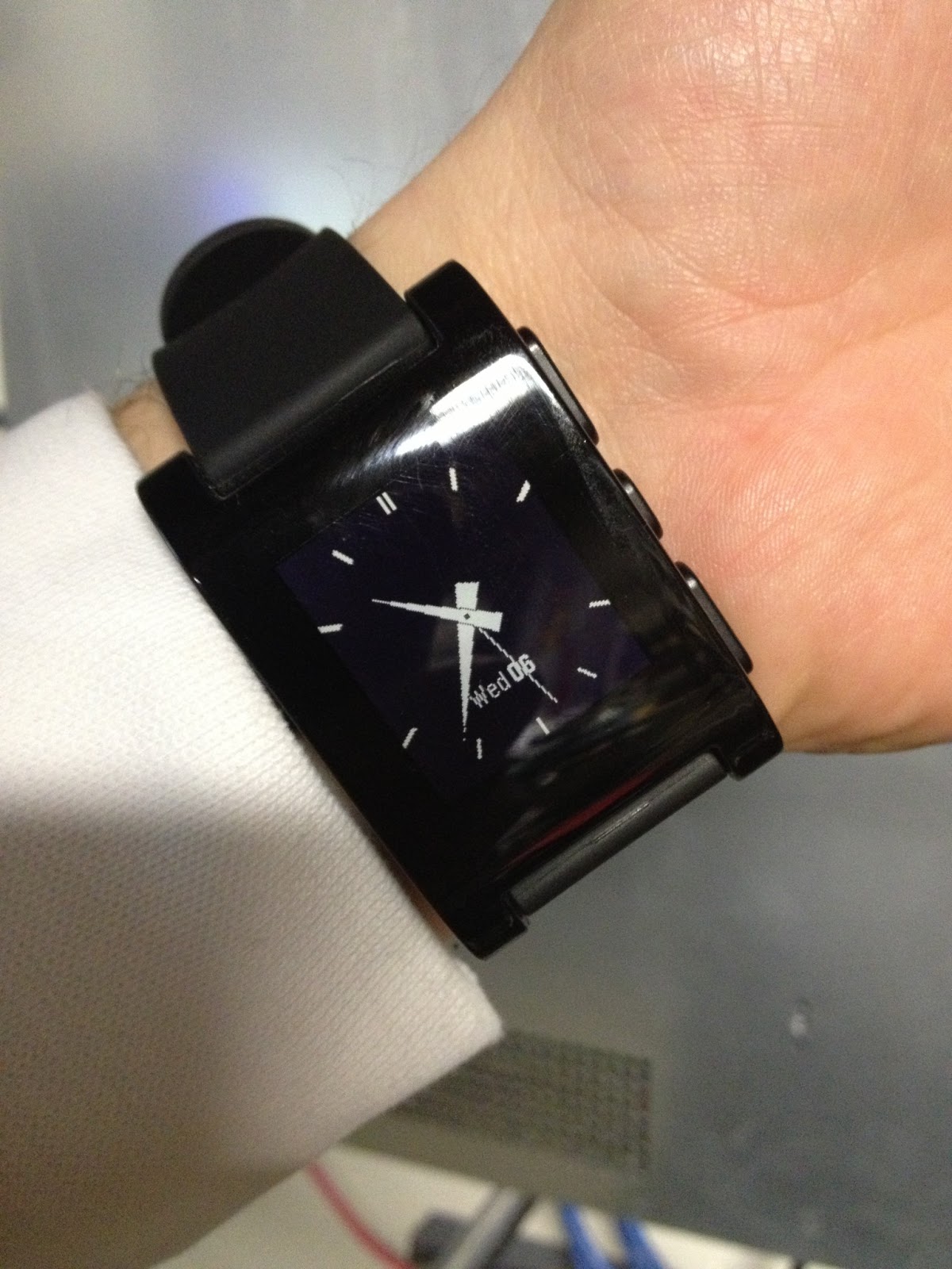 Strangely enough, while the Pebble has a configuration option for setting whether it's a 12- or 24-hour clock by default, one of the original, optional watch faces ("Big Time") was purpose-built to ignore the setting. Since my original inquiries about the behavior, the Pebble team has replaced the original design with a pair of watch faces—Big Time 12 and Big Time 24—to accommodate user desires rather than updating the single face to honor the system setting. This makes me wonder a bit about how sophisticated the API for custom watchfaces is going to be...